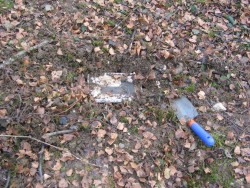 From F and H at CC, walk or drive to WH Car Park. Take main path. Look for Logica Ls on the route. At bench on left turn left. Take path downhill through trees. Pass a three-trunked silver birch. Ignore path to left. Once it opens out on the left, take eighty paces to a single birch. Turn right into trees. See another single silver birch and a two-trunked one behind it. Between these the casket is buried less than one foot below the surface.